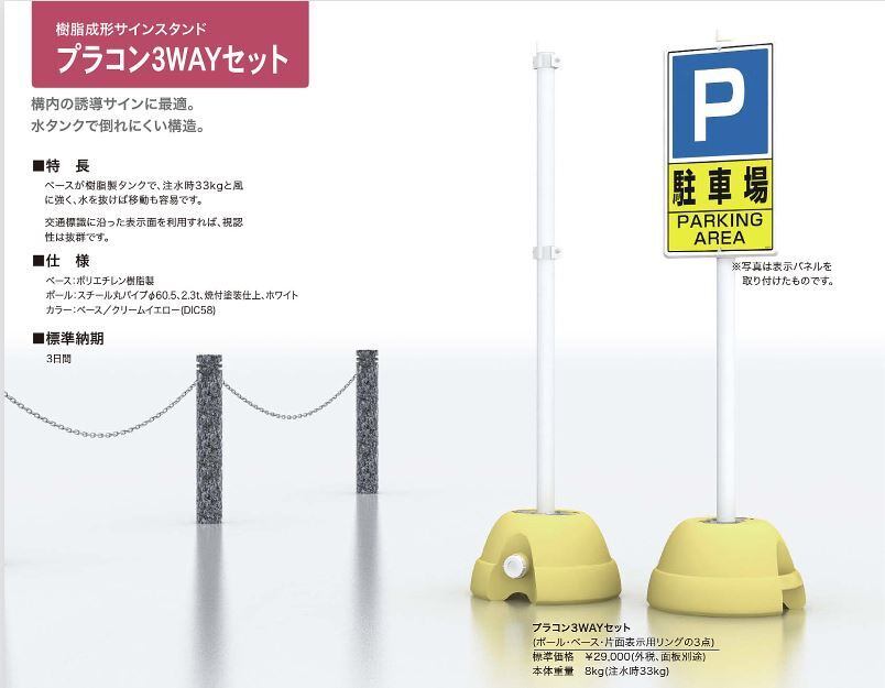 スチール製丸パイプのポールとアルミ製片面表示用リング、樹脂製ベース(土台)
